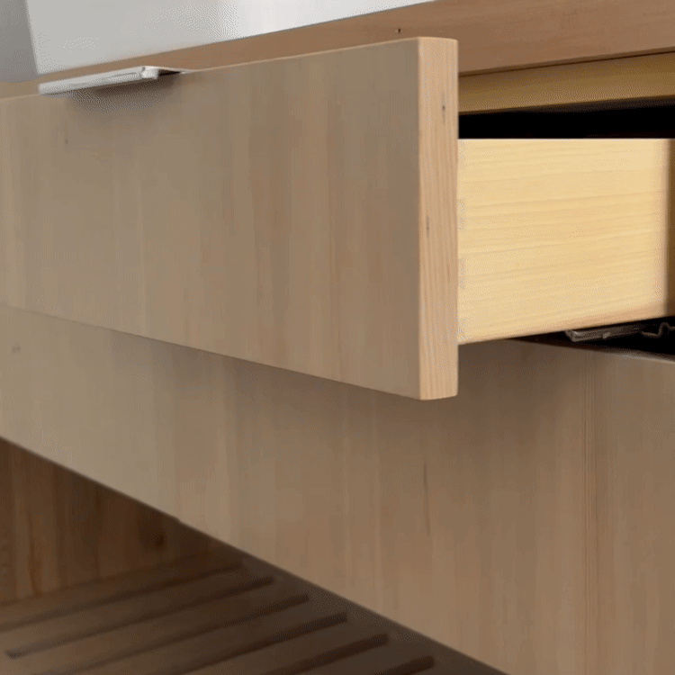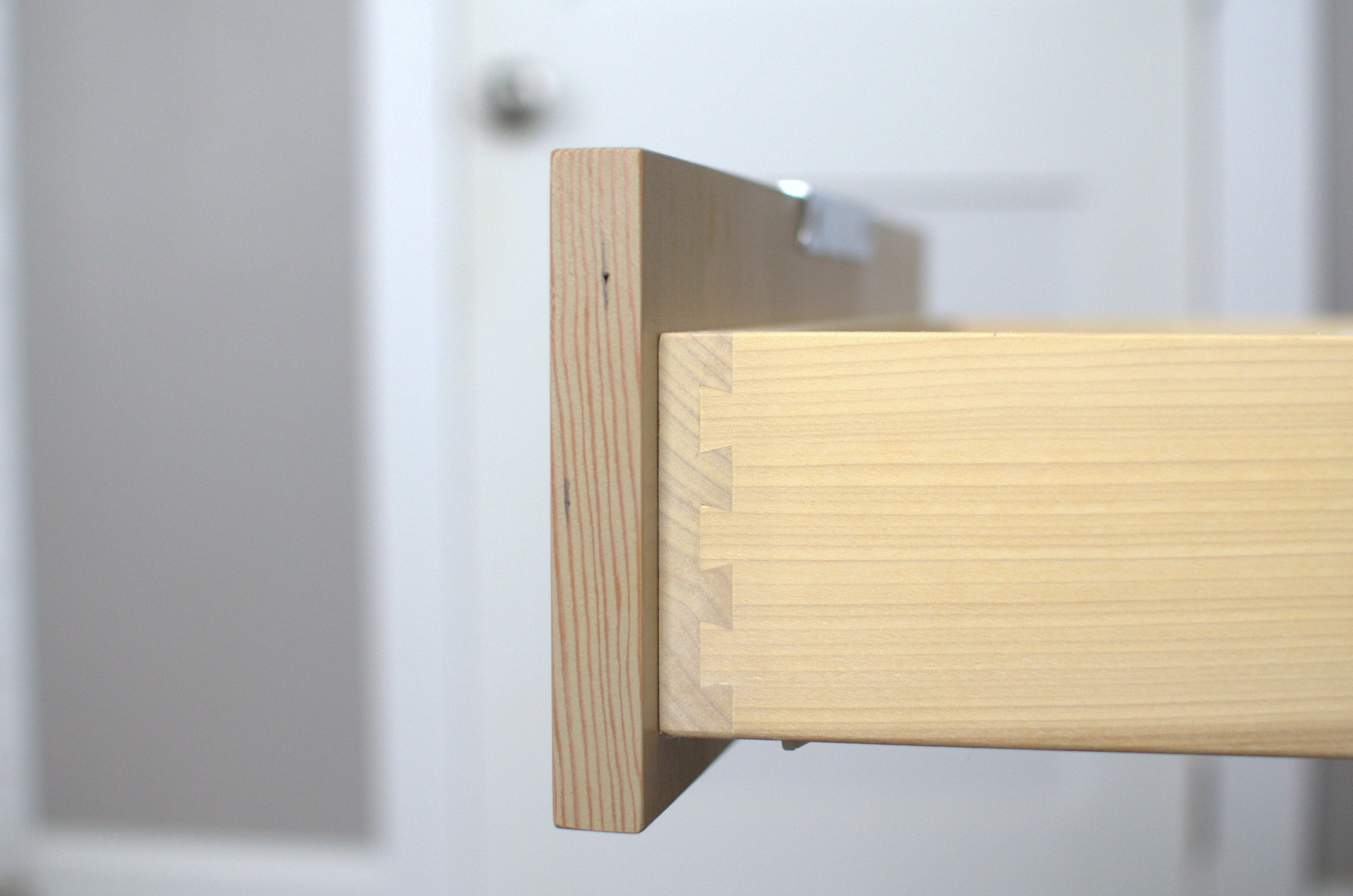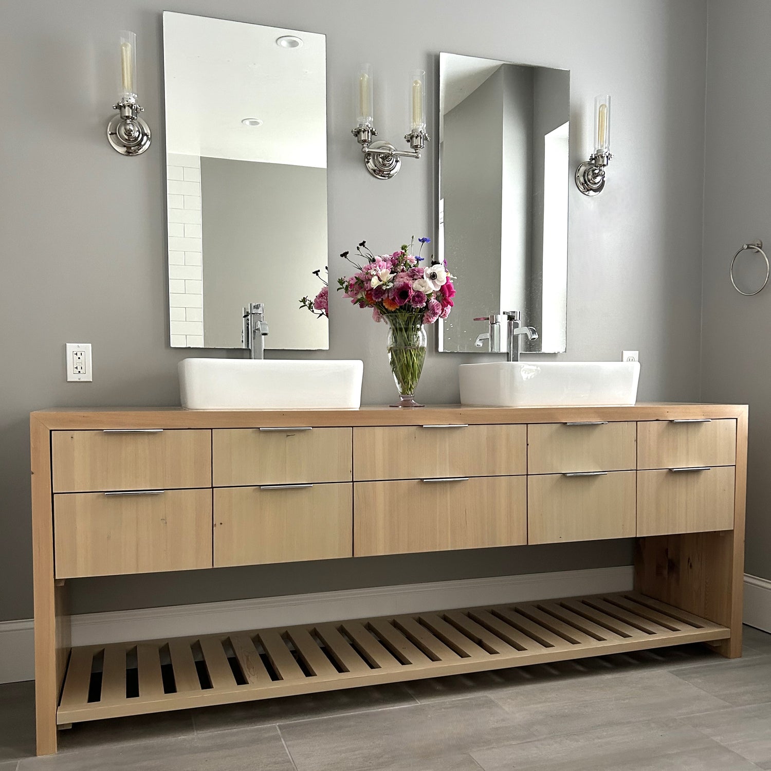 A custom vanity constructed from old growth douglas fir that was reclaimed from a building project. Grain matching of the drawer panels highlights the tight, straight grain of the century-old lumber. A set of 10 soft-close, dovetailed drawers maximizes storage space. Finished with a neutral no VOC stain and waterborne polyurethane finish to preserve the natural color of the wood.