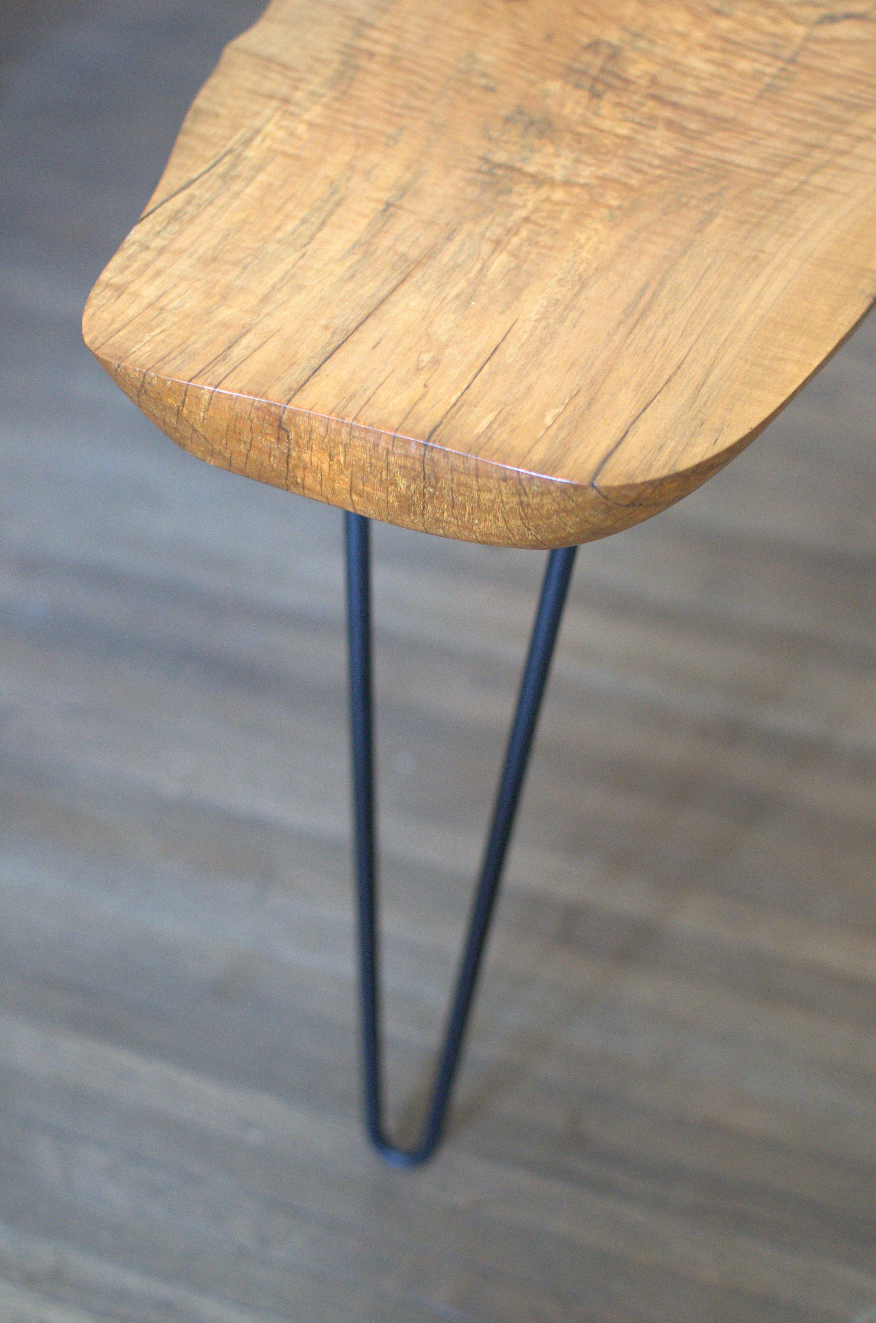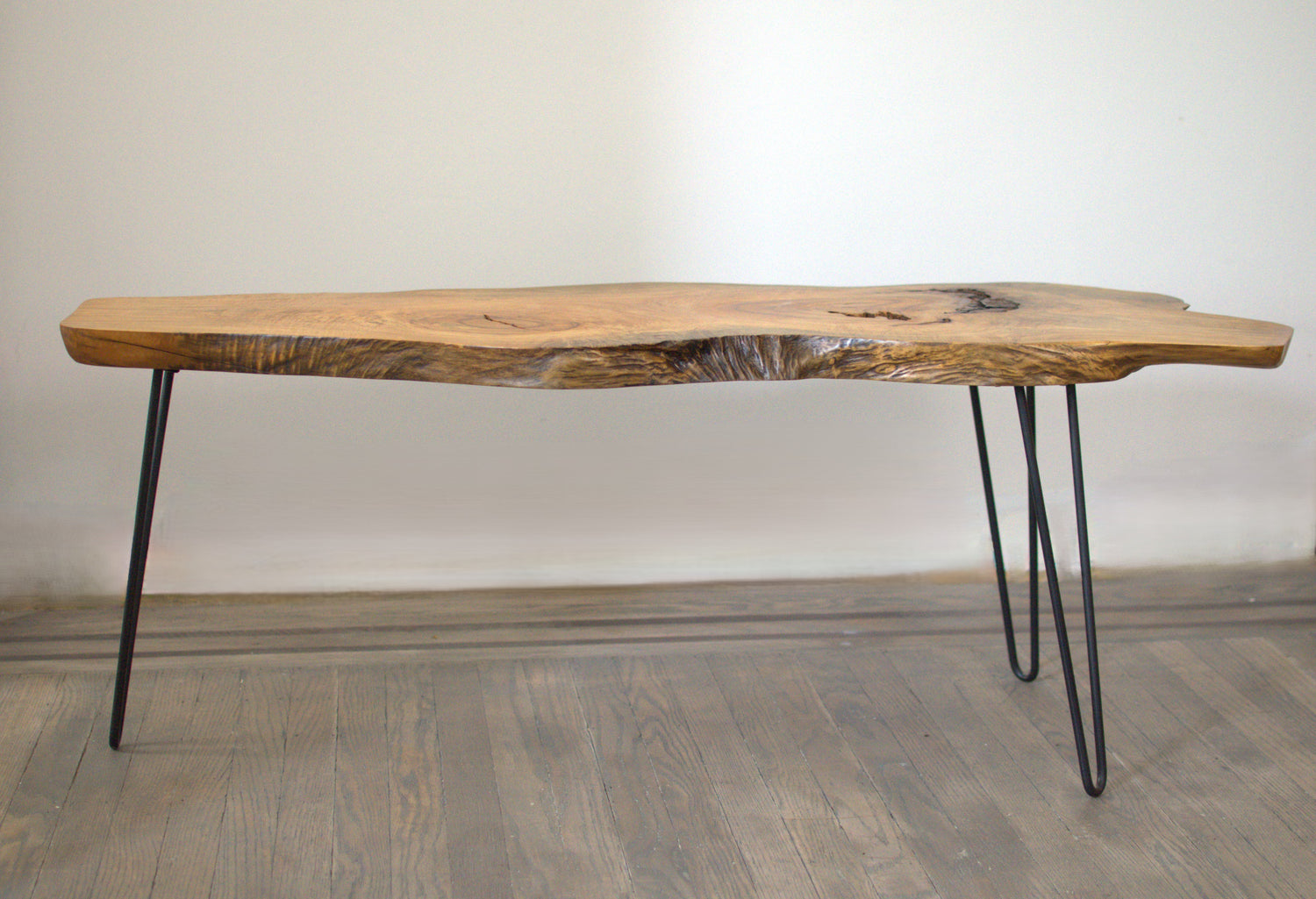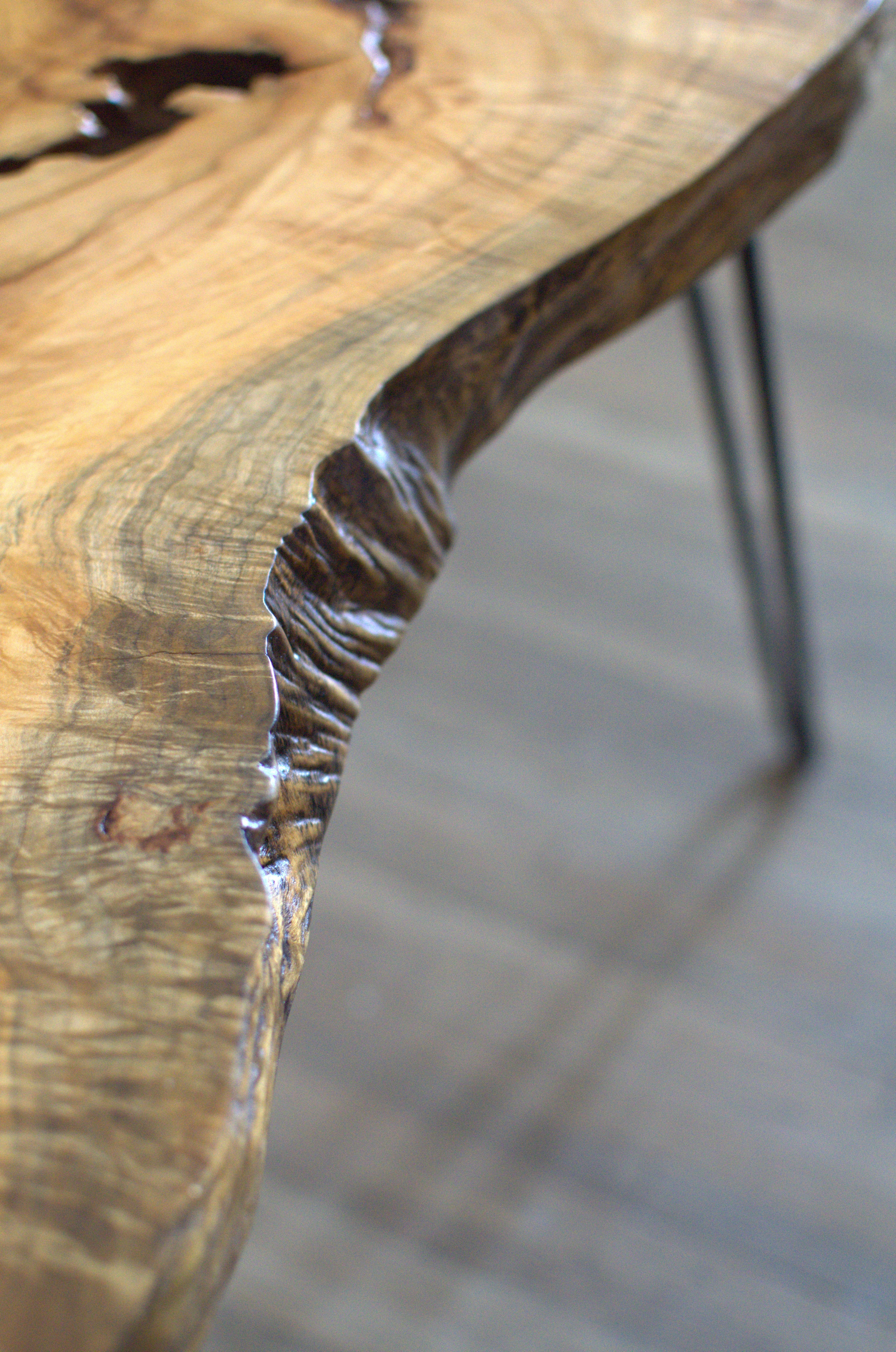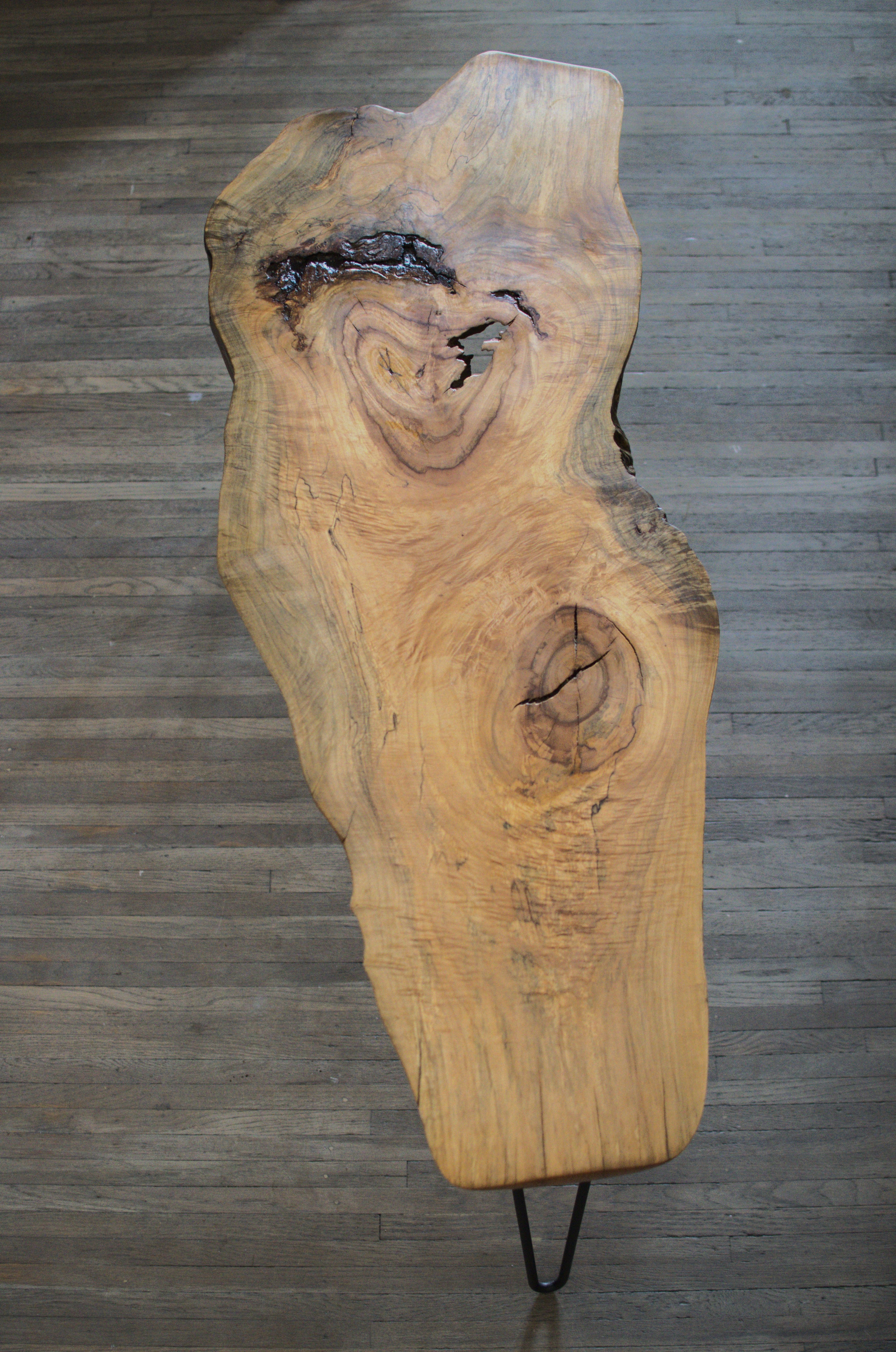 Solid spalted maple top paired with hairpin metal legs. The edges of the slab have been carefully prepared to showcase the natural topography of the wood, and the end-grain hand-shaped to complement the organic form. Natural oil & wax finish.